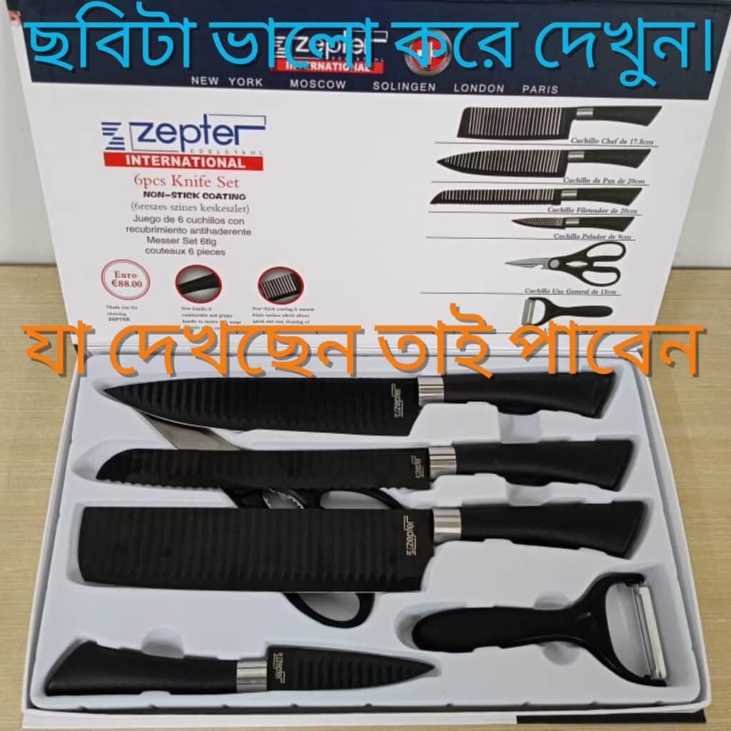 => প্রতিটি ব্লেড খুবই ধারালো, (রেজার শার্প) => বিভিন্ন কাজের জন্য আলাদা আলাদা চাকু ব্যাবহার করতে পারবেন, => ৪ টি কিচেন ছুরি => ১ টি কেচি, => ১ টি পিলার (সবজি ছোলার জন্য) => অরিজিনাল স্টেইনলেস স্টিলের তৈরি, তাই কখনো মরিচা পরবেনা => প্রতিটি চাকুর সাইডে কার্ভ সিস্টেম, তাই সবজি বা ফল কাটার সময়, চাকুতে লেগে থাকবেনা => প্রতিটি চাকুতে ননস্টিক কোটিং দেয়া আছে, তাই যেকোনো ফল ও সবজি কাটতে পারবেন খুব সহজে , => প্রতিটি চাকু খুবই মজবুত, তাই সহজে বাকানো যায়না।